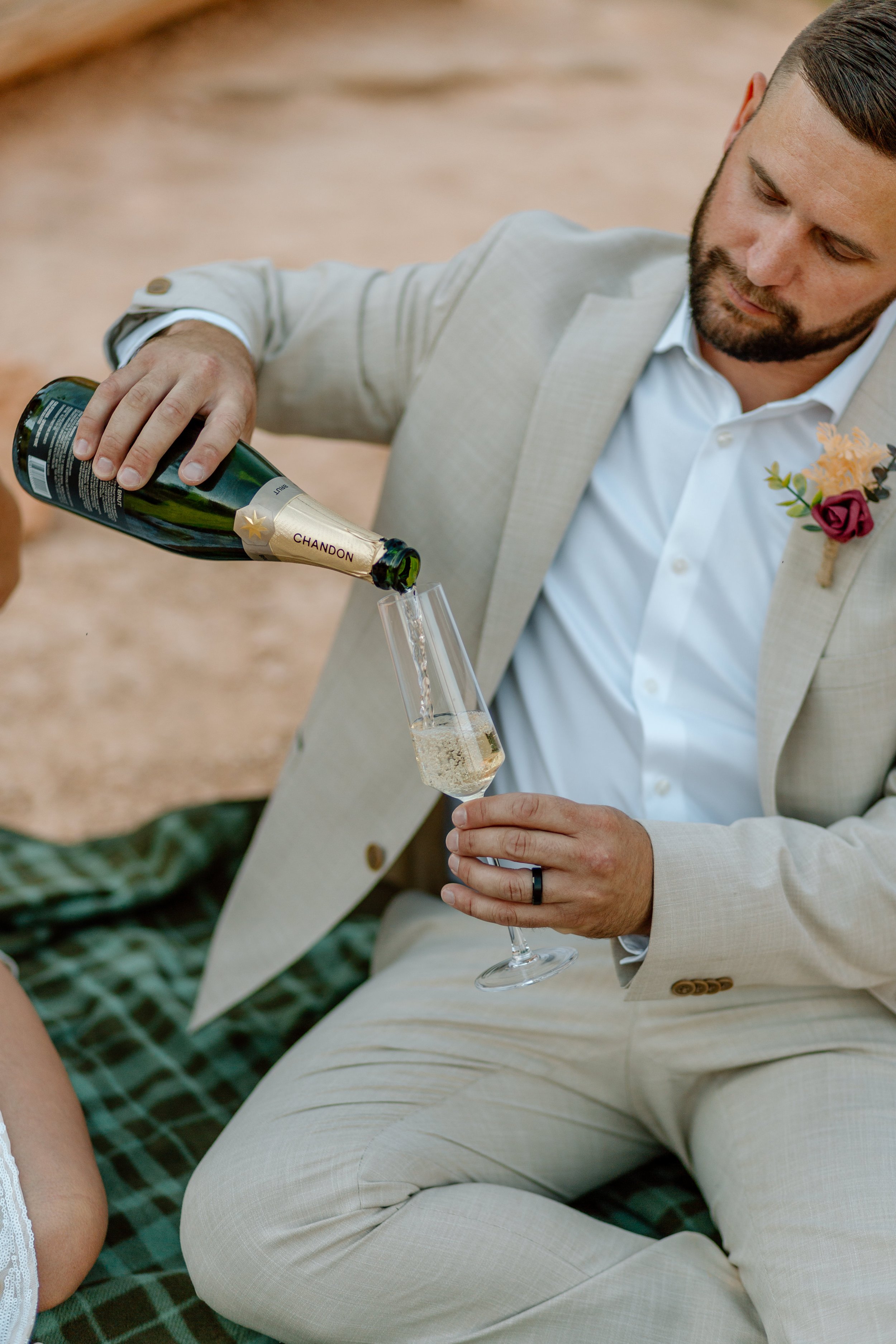 We started with a lovely, quick elopement ceremony overlooking Bryce Canyon’s Main Amphitheater (in adherence with the park’s wedding policies), then we headed out on the Queen’s Garden Trail to get amongst the hoodoos. Once we got down to the “garden,” they popped some champagne and shared some charcuterie. Once we got back to the park, it was dark, and we took some star photos. Bryce is very remote and therefore has incredible stars, as you can see.