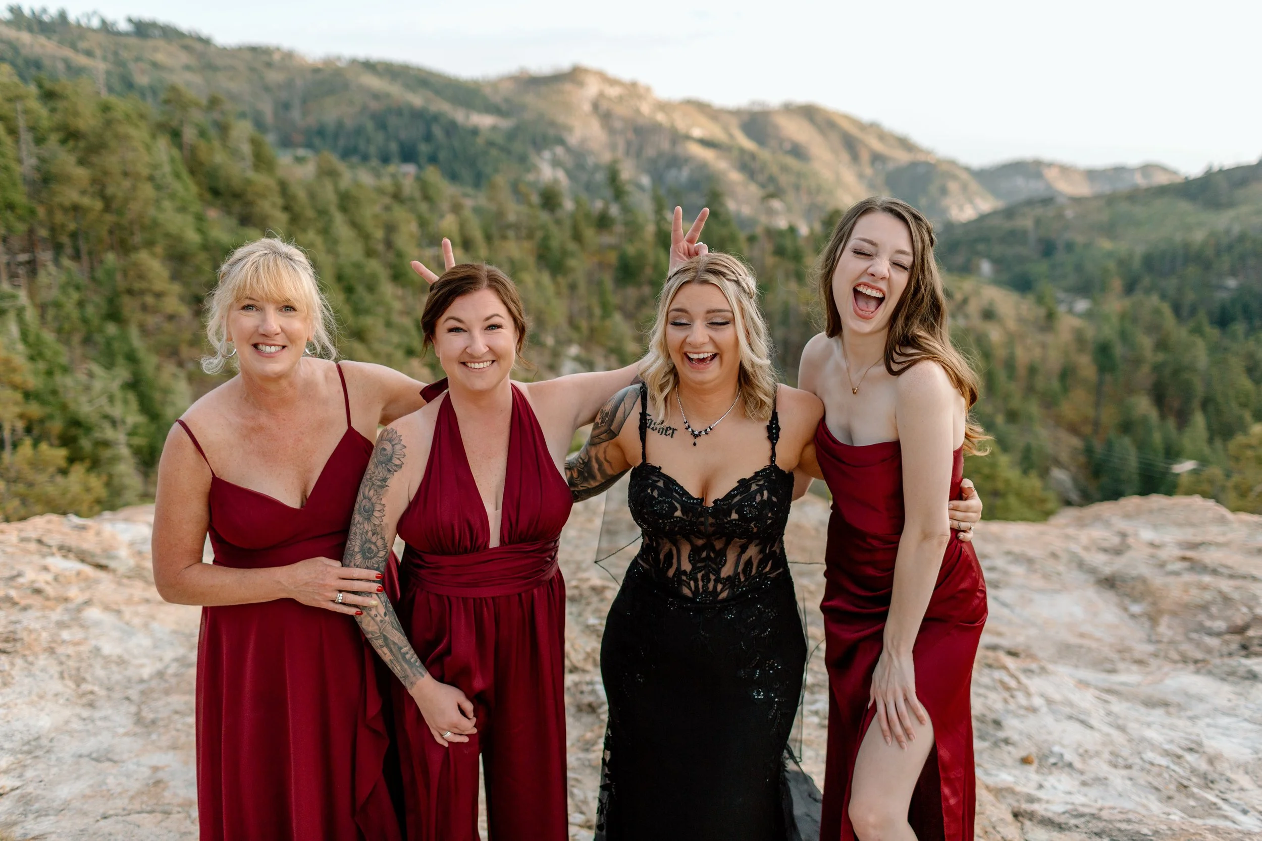 We chose an amazing spot near the top of the mountain with a rocky forest view. Their ceremony was beautiful. One of their best friends officiated, they said some emotional personal vows with their friends and son looking on, and their friends popped champagne behind them for an epic first kiss. After that, everyone toasted with a shot of whiskey - another decision that felt entirely “them.”